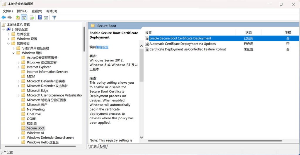 3. 如果计划使用 GPO,可配置 计算机配置 - 管理模板 - Windows 组件 - Secure Boot,如下图所示。