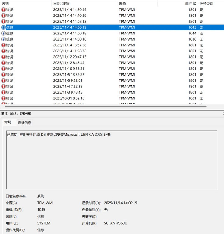 第一条命令将启动证书和启动管理器部署,第二条会立刻运行 AvailableUpdates 所对应的计划任务,否则需等待每 12小时运行一次。当重启设备后其键值变为 0x4100 后,可在执行上面的任务计划,触发启动管理器更新。整个过程 IT 人员都可以通过检查 UEFICA2023Status 和 UEFICA2023Error 注册表键值或 DB 和 DBX 事件(ID 1801,1808)进行跟踪。