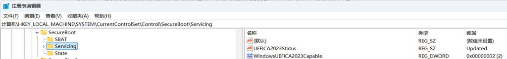 “HKLM\SYSTEM\CurrentControlSet\Control\SecureBoot\Servicing”,UEFICA2023Status 值为 Updated 时表示已完成并应用更新。否则我们需要借助 OEM 的 UEFI 更新程序或微软提供的方案执行。