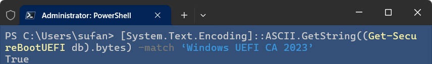 [System.Text.Encoding]::ASCII.GetString((Get-SecureBootUEFI db).bytes) -match ‘Windows UEFI CA 2023’