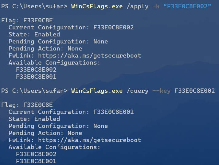 WinCsFlags.exe /apply –-key “F33E0C8E002